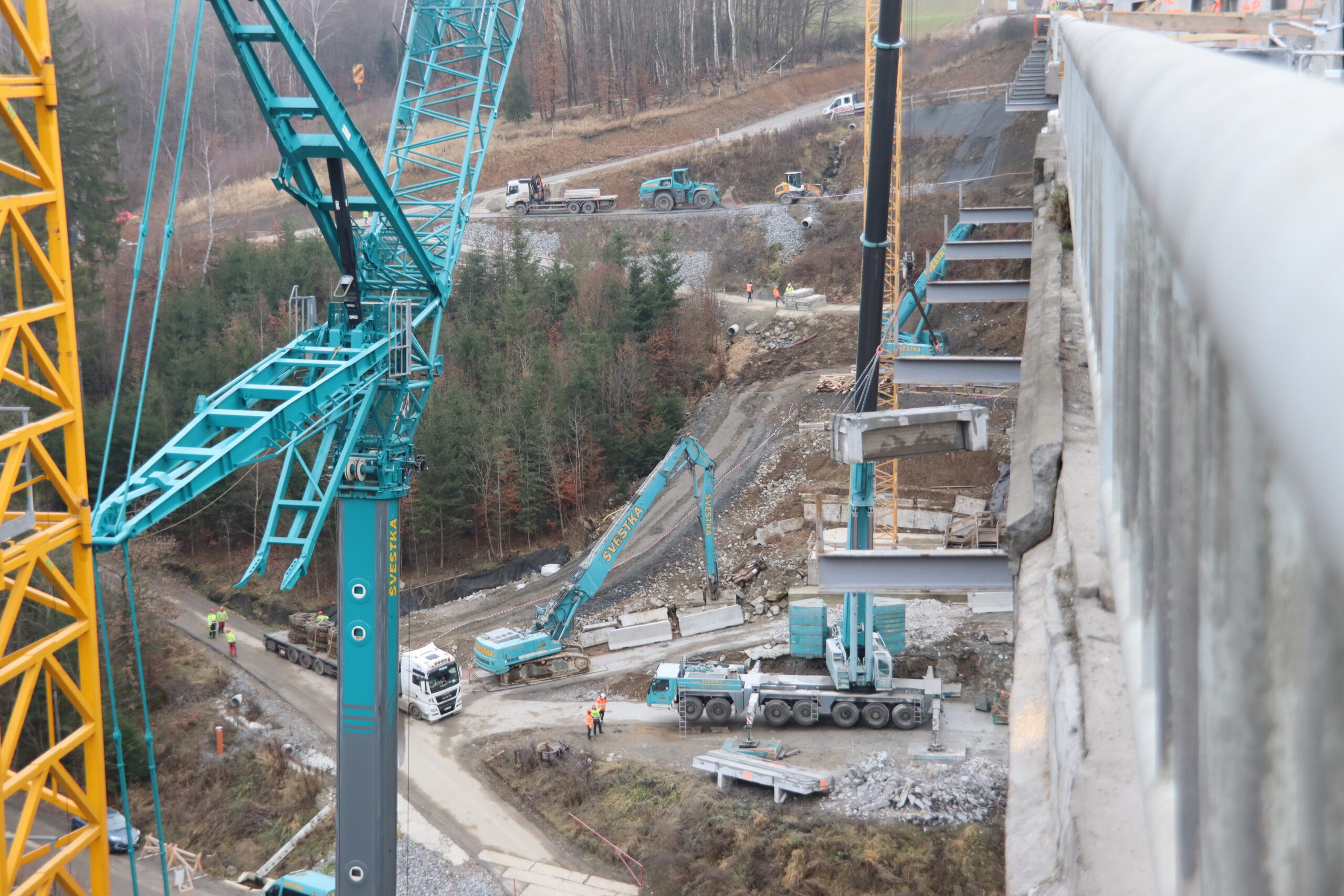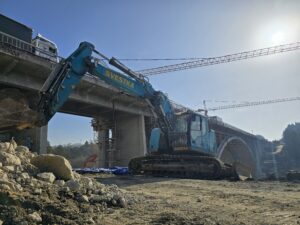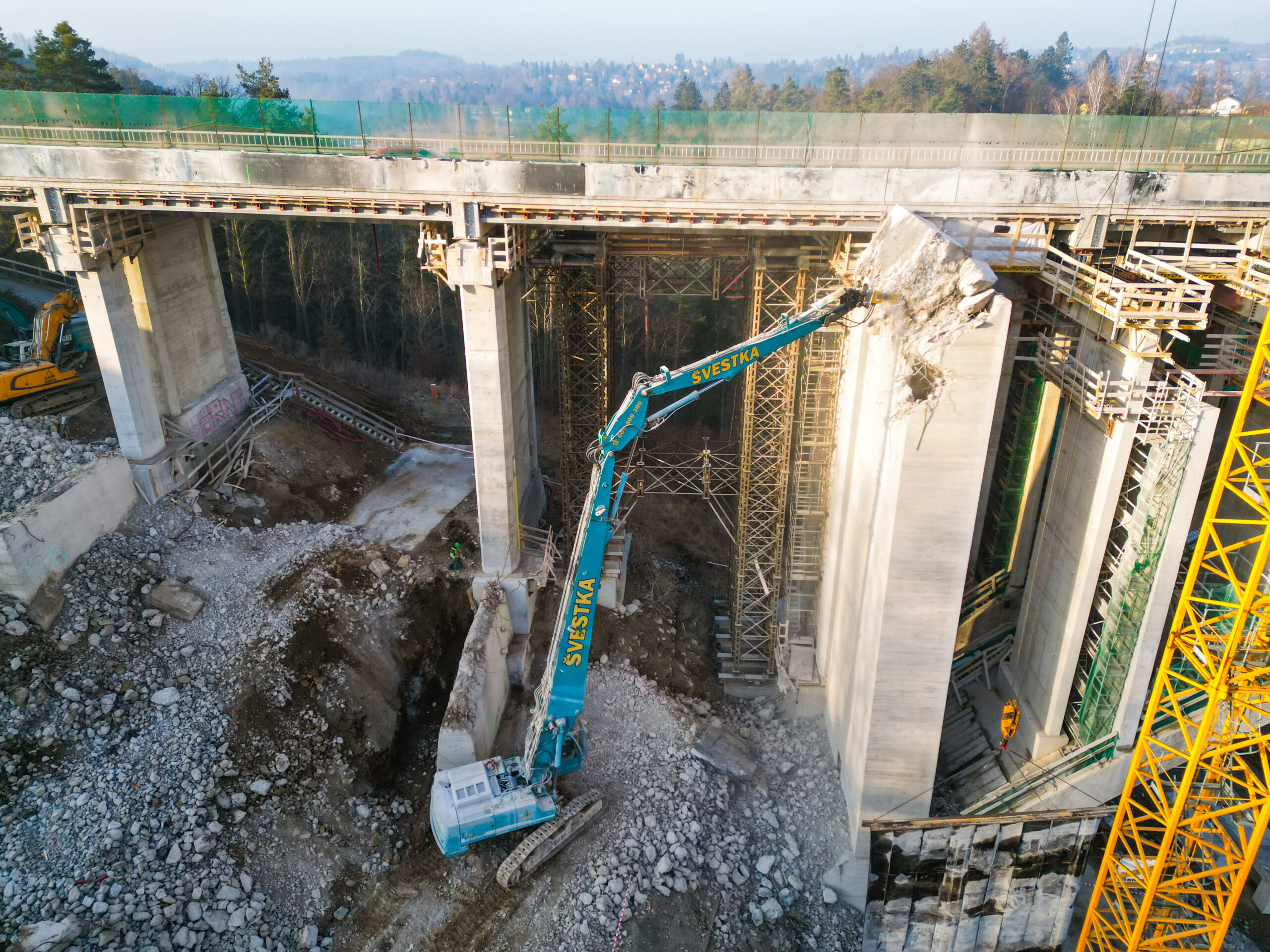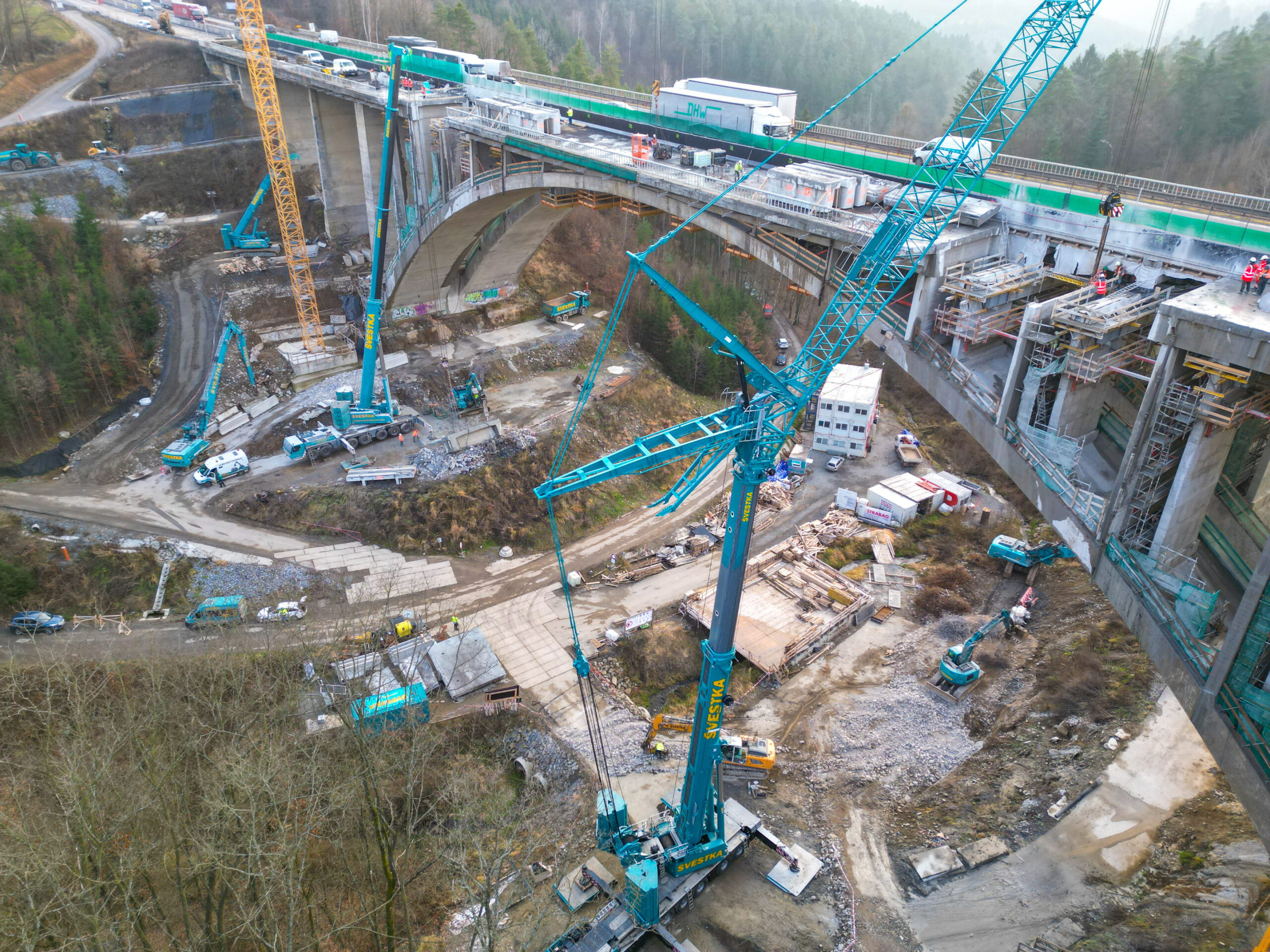 První etapa demoličních prací byla mimořádně náročná především na přesnost provedení. V komplikovaném terénu údolí jsme si připravili speciální rampy pro těžké mobilní jeřáby a demoliční stroje, které umožnily bezpečný a efektivní průběh prací. Nová konstrukce středního mostu se nacházela pouhých 20 cm od odstraňované části původního mostu, což kladlo maximální důraz na pečlivé plánování i samotnou realizaci.