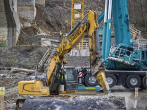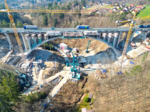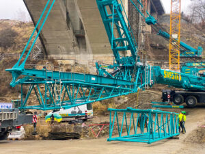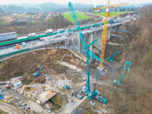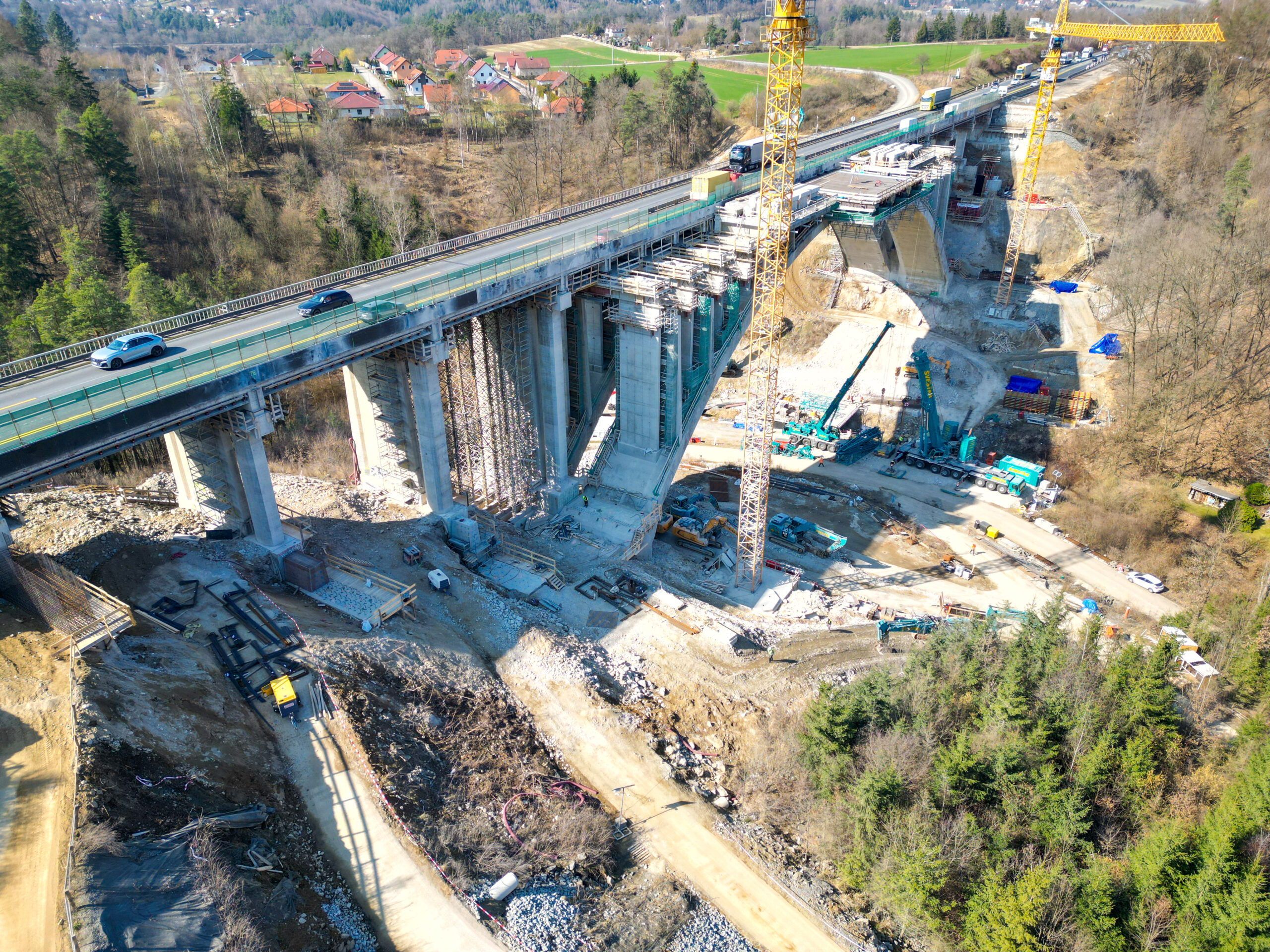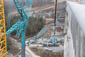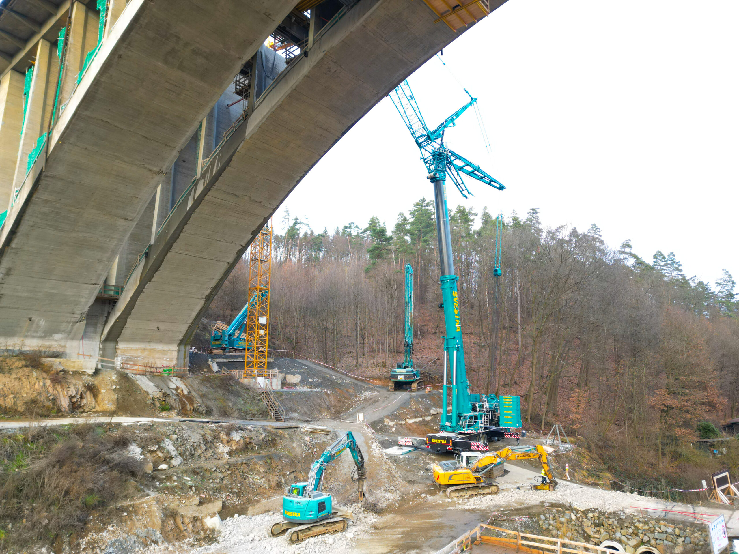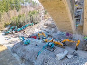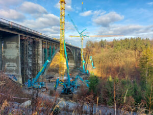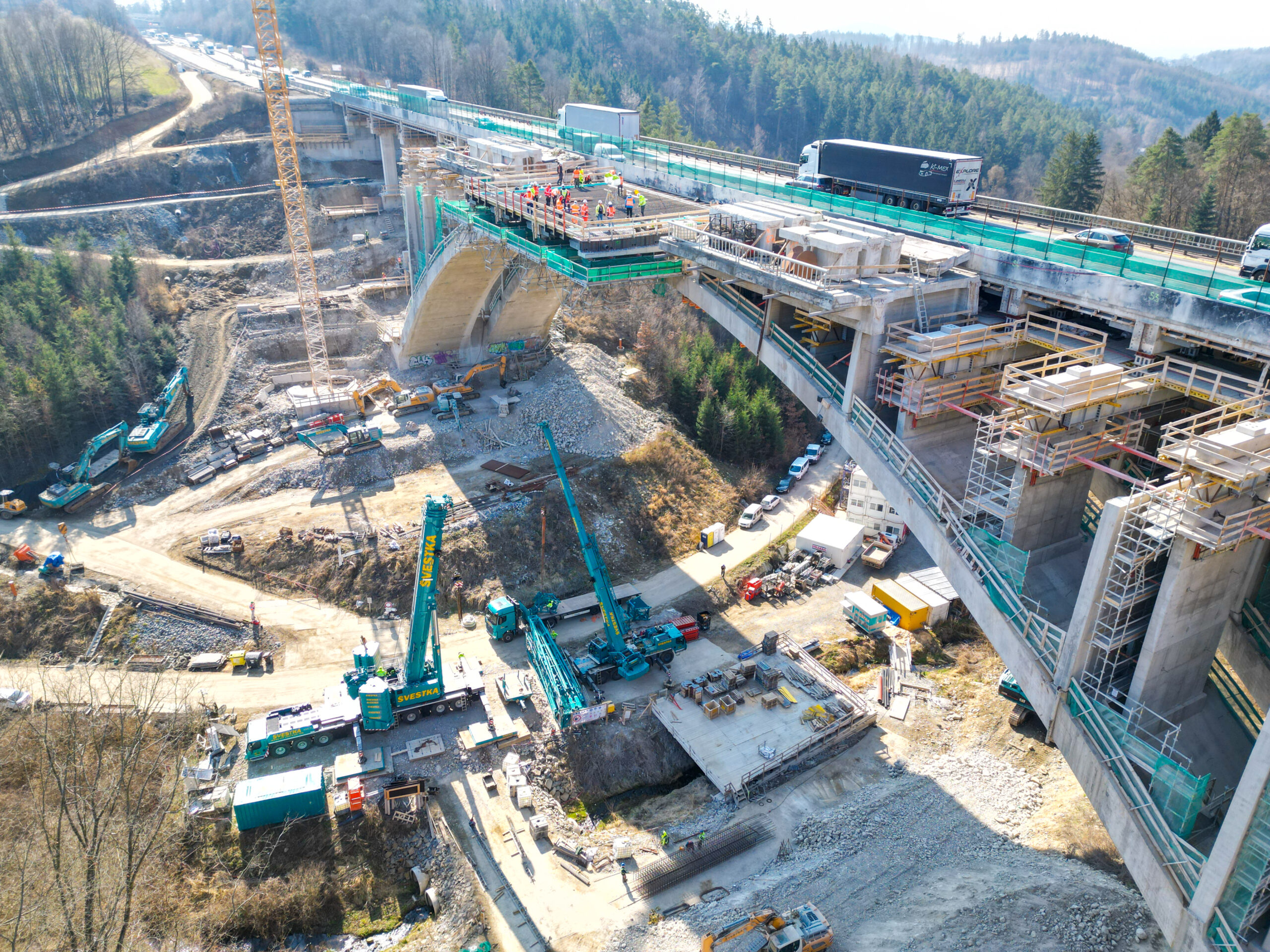 První etapa demoličních prací byla mimořádně náročná především na přesnost provedení. V komplikovaném terénu údolí jsme si připravili speciální rampy pro těžké mobilní jeřáby a demoliční stroje, které umožnily bezpečný a efektivní průběh prací. Nová konstrukce středního mostu se nacházela pouhých 20 cm od odstraňované části původního mostu, což kladlo maximální důraz na pečlivé plánování i samotnou realizaci.