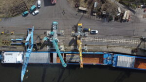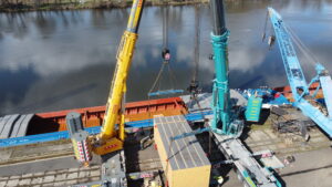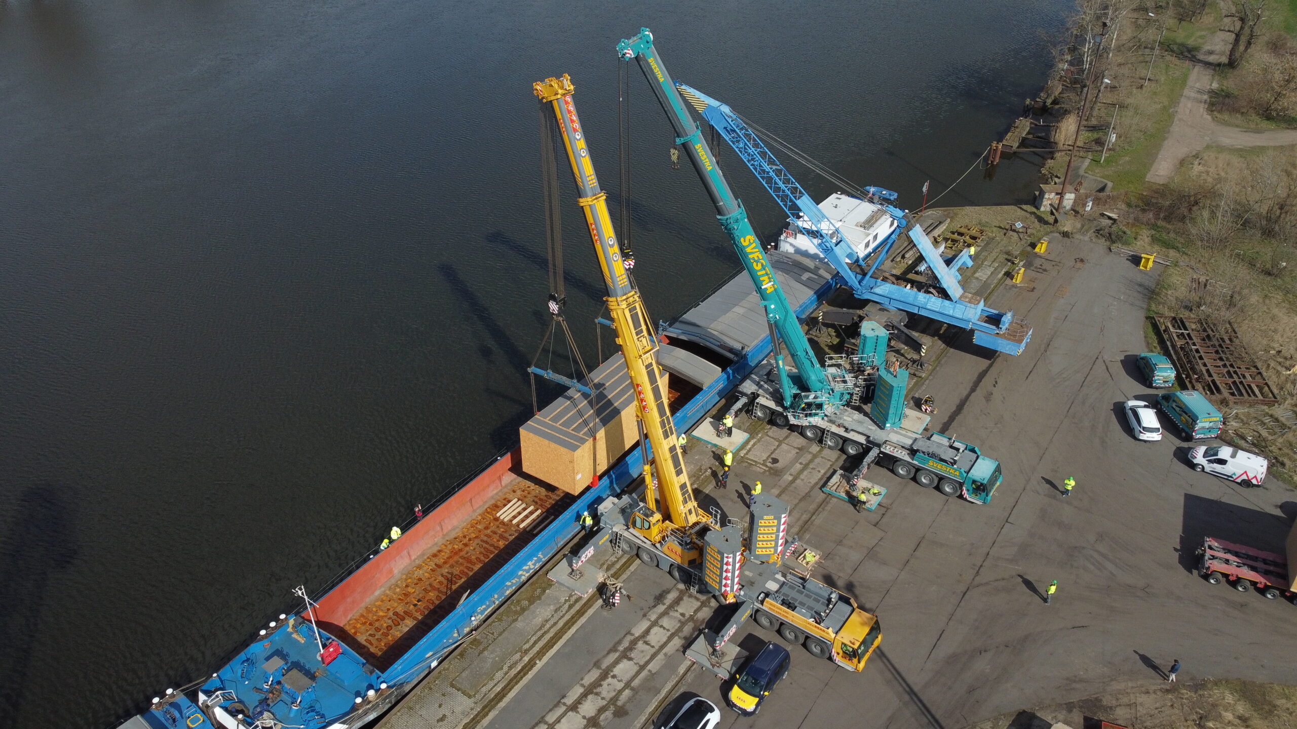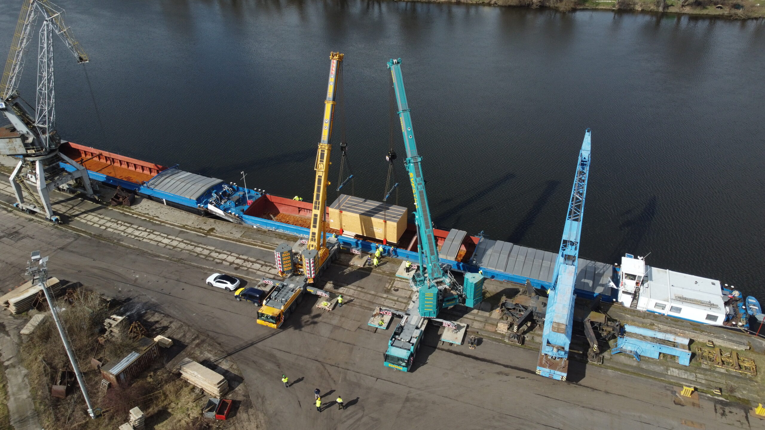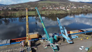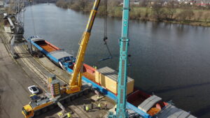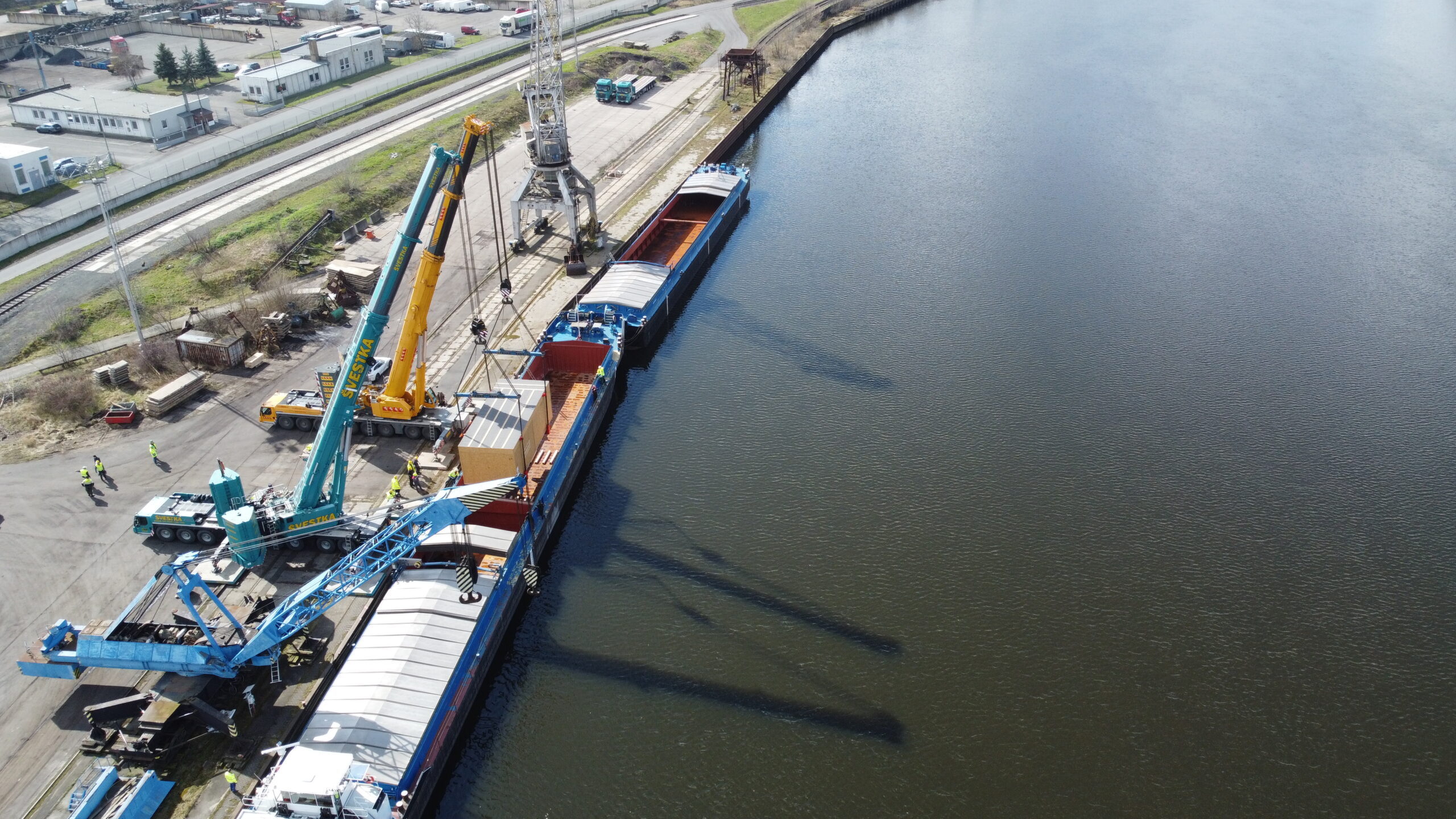 Nakládka generátoru o hmotnosti 225 tun v přístavu Lovosice