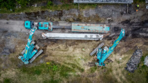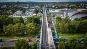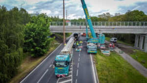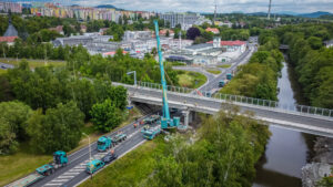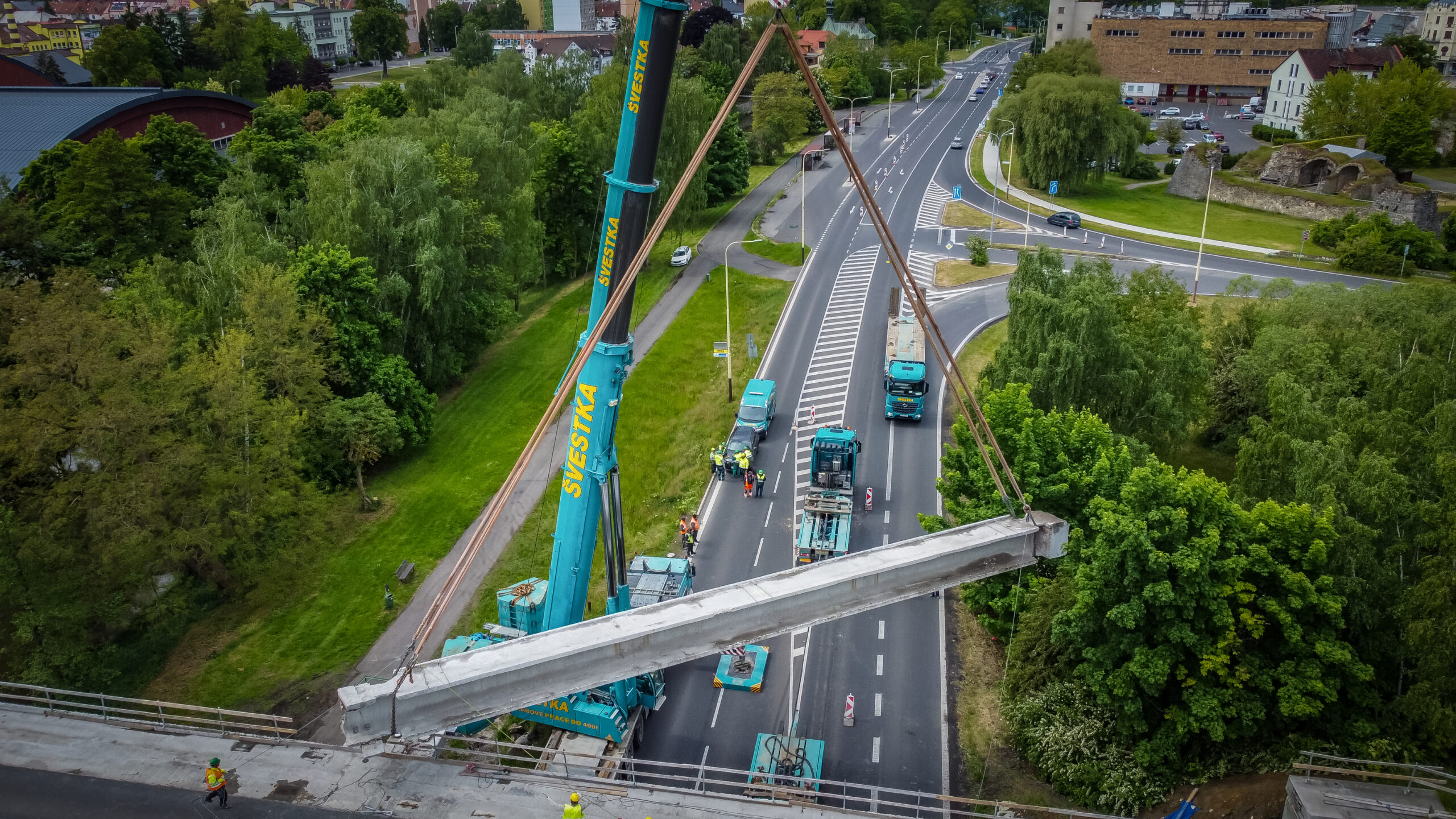 In recent days, we have dismantled the bridge girders in Česká Lípa using a Liebherr LTM 1400 wheeled crane and transported them for disposal as part of the construction – on a Goldhofer telescopic semi-trailer and an Umikov curtain sider. We then used two Liebherr LTR 1100 crawler cranes to unload them. In June, we will be installing new bridge girders here.
